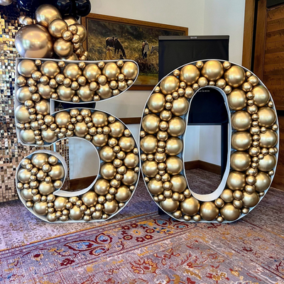 Balloon marquee bouquets feature illuminated numbers or letters paired with balloon accents for a bold display. These are perfect for milestone birthdays, anniversaries, and celebrations across the DFW area.